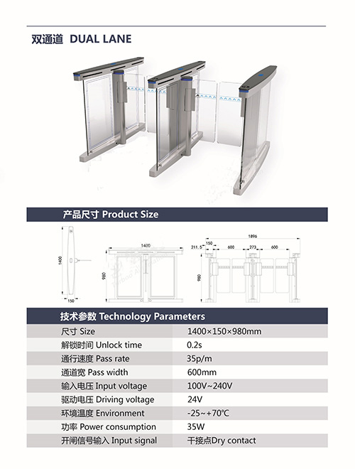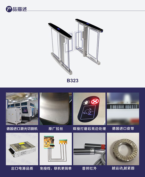 1.速通門B323A系統(tǒng)具備防撞功能,當(dāng)有外物在未授權(quán)的狀態(tài)下撞擊擺桿,擺桿運動角度達到菜單設(shè)定的值(如 2°),控制器_會啟動剎車機構(gòu),阻止擺桿運動,并啟動聲光報警。當(dāng)外力進一步增大,剎車控制器會保護擺桿不被撞斷,外力撤除后,擺桿自動歸位,系統(tǒng)正常; 2.速通門B323A系統(tǒng)具備角度分辨和零位自檢功能,包含 500P/R 編碼器,分辨精度高,這種高精度的傳感器的優(yōu)勢是使擺桿轉(zhuǎn)動_; 3.非法進入有報警提示功能; 4.防沖功能,在沒有接收功能開閘信號,擺臂自動鎖死; 5.紅外防夾功能,在擺臂復(fù)位的過程中紅外檢測到人在通道中,擺臂會自動回到打開狀態(tài); 6.速通門B323A統(tǒng)一標(biāo)準(zhǔn)的對外電氣接口,可與多種讀卡器相掛接,并可通過管理計算機實現(xiàn)遠程控制與管理; 7.系統(tǒng)設(shè)有過流保護裝置,當(dāng)負(fù)載_過某設(shè)定值(如 2._),系統(tǒng)停止工作,以免燒壞電機等設(shè)備;